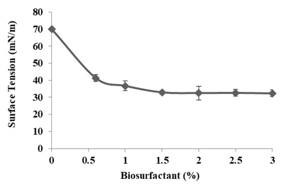 The ability to reduce surface tension depends on the specific concentration of the surface-active compound—CMC, which is defined as the minimum concentration of biosurfactant required to yield the maximum surface tension reduction in water and initiate micelle formation (Figure 5). Efficient surfactants are required to reduce surface tension [41]. The CMC of the biosurfactant produced by Cunninghamella echinulata was approximately 1.5% and the surface tension at that point was 31.7 mN/m.