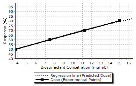 The lethal dose (LD50) is the dose required for a given substance or type of radiation to kill 50% of a population under testing (Figure 6). The LD50 is often used as an indicator of the acute toxicity of a substance, where a higher lethal dose is considered less toxic. The biosurfactant from Cunninghamella echinulata was first tested with regards to toxicity in short-term bioassays using brine shrimp. Counting the surviving organisms determined the dose limit concentration (LD50: 18.11 mg/mL) of biosurfactant (Figure 6), indicating the absence of toxicity of the biosurfactant.