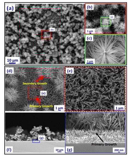 Scanning electron microscopy (SEM) images of ZnO urchins on a seeded silicon substrate (a), and SEM images of the region not covered by the urchins revealing vertical ZnO nanoneedles from the primary growth (d,g), with enlarged views shown in (b,c,e,f) respectively. (Seeding concentration of zinc acetate dihydrate—5 mM, synthesis time for ZnO urchin growth—12 h, and temperature—20 °C).