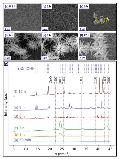 (a–f) SEM images of seeded silicon substrates in 5 mM zincate growth solution at different growth time intervals, t = 0.5–12 h; and (g) corresponding GIXRD data for the substrates.