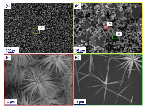 Surfaces bearing ZnO nanostructures are among the most widely studied, with a wide range of applications in gas and bio-sensing, field emission devices, ultraviolet detectors, and photovoltaics [12] due to their thermostability [13], low-cost production [14], antimicrobial properties [15,16,17,18,19], and biocompatibility [20]. Several fabrication methods of ZnO nanostructured surfaces have been reported [21,22,23,24,25,26,27,28], such as hydrothermal synthesis, laser ablation, sputtering, thermal decomposition, evaporation induced self-assembly [29,30], and the sol-gel technique. Various ZnO nanostructures that have been reported include one-dimensional (1-D) morphologies such as nanowires [31,32,33], nanofibers [29,30], nanorods [34,35,36,37], micro-dendrites [38,39], and nanotubular structures [40,41,42,43,44], as well as 3-D architectures such as flowers/urchins [45,46,47,48,49,50], tetrapods/jack-like [51,52], and hedgehogs [53]. The 3-D nanostructures with enhanced surface area may be used as substitutes for 1-D nanostructure arrays with enhanced functionalities, but their fabrication requires either sophisticated instrumentation or elevated temperatures (and thus high energy input).