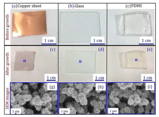 Photos of seeded substrates before and after growth of ZnO urchins, and corresponding SEM images of the ZnO urchins formed on the substrates: (a,c,g) copper, (b,d,h) glass slide, and (c,e,i) polydimethylsiloxane (PDMS) surfaces.