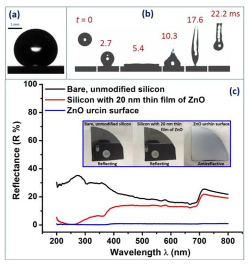 In addition, the ZnO urchin coated surface also demonstrated anti-reflective behavior. Figure 5c showing <1% reflectance (R) over the wavelength range λ = 200–800 nm on the urchin surface, compared to two control samples (bare Si and Si with 20 nm ZnO thin film). There have been previous reports on fabrication of nanostructured anti-reflective surfaces [6,11,64,65,66,67,68,69,70]. Different techniques such as dry etching, wet etching, metal assisted etching, nanoimprint lithography, etching using O2 plasma and inductively coupled plasma, optical lithography followed by etching etc. [71] have been used to fabricate such surfaces on silicon, polymers, and glass to achieve low reflectance. In comparison, the fabrication method we used to achieve low reflectance (R < 1%) was simple, with the synthesis undertaken at room temperature without the need for sophisticated instrumentation.