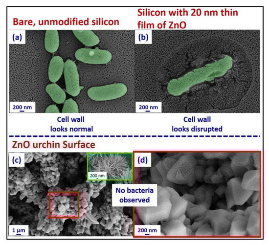 Isolated single colonies of E. coli K-12 (MG 1655) were used to prepare the pre-inoculum [54]. The culture was grown in Luria Bertani (LB) medium for 8 h at 37 °C with constant shaking at 160 rpm. A 0.2% pre-inoculum was added into 10 mL of LB medium and was allowed to grow to 0.3 optical density (O.D.) at 600 nm [55]. The cells were subsequently pelleted and washed with phosphate-buffered saline (PBS). A cell suspension of 0.01 O.D. at 600 nm was used for studying the bacterial interaction with the bare, unmodified silicon, silicon with a 20 nm thin film of ZnO, and ZnO nanourchin surfaces.