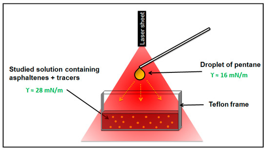 The highly sensitive method described in reference [22] was used in order to detect the surface activity of asphaltenes at oil/air interfaces. The original experimental setup consists in the generation of a Marangoni flow at a liquid/air interface by suspending a droplet of solute over a liquid bath. A concentration gradient is generated by condensation of the evaporated solute and, with the surface tension of the two liquids being different, a surface tension gradient forms at the interface. The generated flow is modified in the presence of surface active agents. The addition of a very small amount of surfactants can turn the flow into an oscillatory flow allowing a sensitive detection of traces of surfactants. First we reproduced the experiment described in [22] on solutions of tetradecyltrimethylammonium bromide (TTAB—Sigma Aldrich) in deonized water (cmc of TTAB is 5.0 × 10−3 mol/L). The setup consisted of a liquid bath of cylindrical shape containing tracers above which a droplet of ethanol was formed with a neMESYS high precision syringe pump (Cetoni, Korbussen, Germany). We quantitatively measured the flow rate α in the region close to the symmetric axis according to the method described in [22] using a high speed camera (Mini AX, Photron, Tokyo, Japan) and the plug-in ParticleTracker for ImageJ [23]. For the oil mixtures containing asphaltenes studied in this work, we adapted the setup by using a droplet of pentane. Indeed, pentane is a volatile solvent which is soluble in toluene or decane/toluene mixtures. In the case of highly opaque solutions, a 2D-version of the setup was used. The cylindrical liquid bath is replaced by a rectangular tank (section 6.9 × 2.2 cm and thickness 2 mm) consisting of two glass slides clipped on both sides of a Teflon frame. The motion of the tracers are visualized using a laser sheet (StingRay 640 nm, Coherent Inc., Santa Clara, Ca, US) placed vertically as described in Figure 1. The experiments were performed on mixtures of decane/toluene containing different weight percentage of decane and different concentration of either asphaltenes TR or MO at their limit of precipitation: