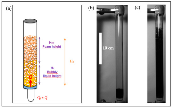 Description of the foamability test. (a) Scheme of the liquid column during a foamability test. The upper part of the column consists of a foam of height and the lower part of the column consists of a bubbly liquid of height . (b,c) are photographs taken before (b) and during (c) a foamability test of a mixture of decane/toluene (45/55 wt%) containing 5 wt% of asphaltenes. The foamability is measured at a nitrogen flow rate of 5 × 10−6 m3/s and at an initial height of liquid introduced equal to 2.8 cm.