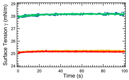 Top curve: Surface tension measurements obtained with the pending drop tensiometer of a solution of toluene without asphaltenes (green/light symbols) and with 5 wt% of asphaltenes TR (blue/dark symbols). Bottom curve: same for a mixture of decane/toluene without asphaltenes (yellow/light symbols) and with 5 wt% of aphaltenes TR (red/dark symbols).