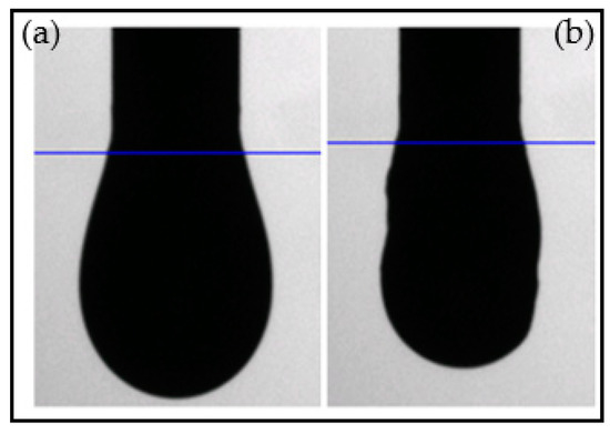 Photographs of a droplet of decane/toluene (45/55 wt%) mixture containing 5 wt% of asphaltenes TR at t = 2500 s. (a) before and (b) after deflation of the drop: observation of an asphaltene layer at the surface of the drop.