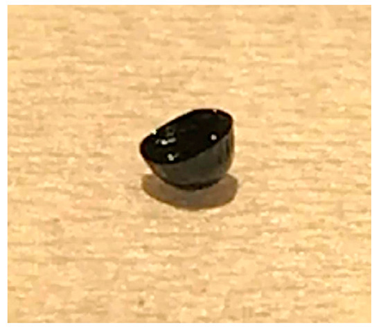 Over longer time scales, the surface tension was observed to vary. That effect was systematically associated with the formation of a solid layer at the surface of the droplet, which prevents proper surface tension measurements. The layer becomes solid like with elapsed time and it can be observed by gradually deflating the droplet formed by the tensiometer as shown in Figure 4. A photograph of the remaining layer after deposition of the drop on an absorbing paper is shown in Figure 5.