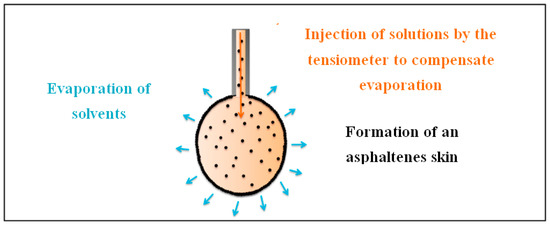 Scheme explaining the evaporation of solvents on the surface of the droplet, the injection of the mixture by the tensiometer to compensate this effect and the formation of a layer of asphaltenes.