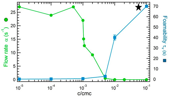 Velocity rate α obtained with the Marangoni flow setup and foamability as a function of the concentration of the added surfactant for solutions of TTAB in water. The velocity rate was measured at the surface of a bath containing the studied solutions above which a droplet of ethanol is suspended. The zero values of α correspond to the suppression of steady flow. The value of the foamability obtained for the solution at 10−1 cmc is only indicative since the foam generated is very stable and overfills the glass column: the arbitrary value of the foamability is indicated by a black star.