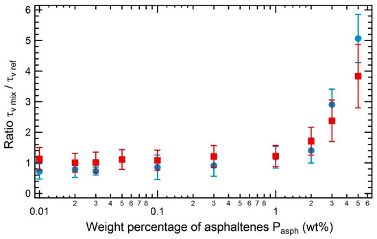 Ratio of foamability between the foamability of the mixture containing asphaltenes and the foamability of the mixture containing no asphaltenes as a function of the weight percentage of asphaltenes dispersed in the mixture : asphaltenes TR dispersed in decane/toluene (45/55 wt%) (blue circles) and asphaltenes MO dispersed in decane/toluene (35/65 wt%) (red squares). The flow rate of nitrogen is equal to 5 × 10−6 m3/s and the initial height of liquid introduced is 1.8 cm.