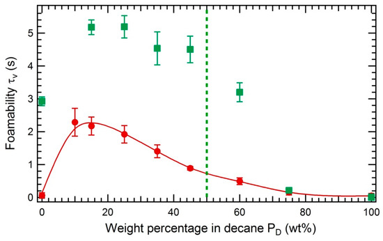 Foamability as a function of the weight percentage of decane : mixtures of decane/toluene (red circles) and mixtures of decane/toluene with 5 wt% of asphaltenes TR (green squares). The green dotted line corresponds to the precipitation limit of asphaltenes TR in decane/toluene mixture. The precipitation limit is 50 wt% of decane. The foamability tests were performed at a flow rate of nitrogen equal to 1.04 × 10−5 m3/s and an initial height of liquid of 1.8 cm.
