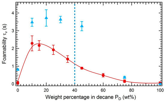 Foamability as a function of the weight percentage of decane : mixtures of decane/toluene (red circles) and mixtures of decane/toluene with 3 wt% of asphaltenes MO (blue triangles). The blue dotted line corresponds to the precipitation limit of asphaltenes MO in decane/toluene mixture. The precipitation limit is 40 wt% of decane. The foamability tests were performed at a flow rate of nitrogen equal to 1.04 × 10−5 m3/s and an initial height of liquid of 1.8 cm.