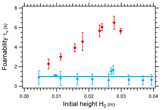 Foamability as a function of the initial height of liquid introduced in the glass column: decane/toluene (45/55 wt%) (blue circles) and decane/toluene (45/55 wt%) with 5 wt% of asphaltenes TR (red diamonds). Solid lines are guide for the eye. The flow rate of nitrogen is equal to 1.04 × 10−5 m3/s. The full line corresponds to the value of the foamability of a decane/toluene solution obtained by averaging all the measured values.