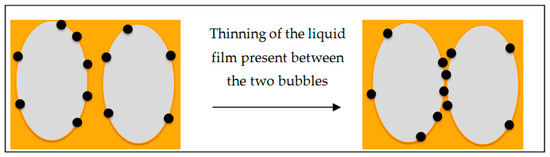 Therefore, we suggest that a small quantity of asphaltenes are trapped at the interface, that they do not contribute to the interfacial energy, but that during the drainage of the liquid films within the foam, they are trapped in the liquid films and then behave as a barrier against coalescence of bubbles (Figure 13).