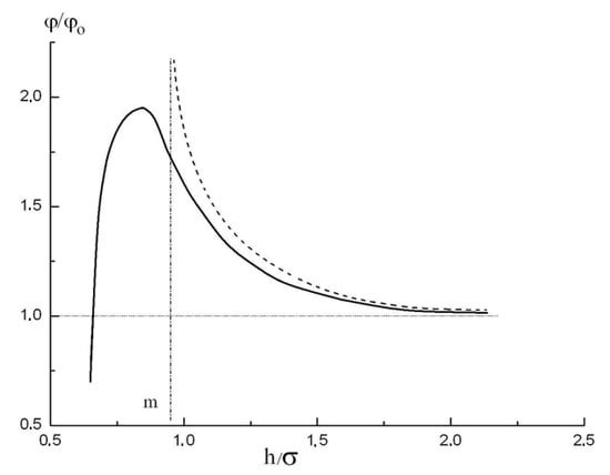 The potential energy of molecular associate in very thin pores was theoretically studied in [15]. In particular, the ratio of the potential energy of molecular associate in a slit-like pore to the potential energy of molecules relative to their interaction with the open plane surface was calculated and this dependence plotted vs. h/σ is shown by the solid curve in Figure 1.