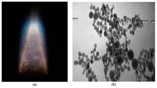 Photograph of laminar diffusion dust plume of aluminum particles (a) and micrograph of aluminum oxide particles (b).