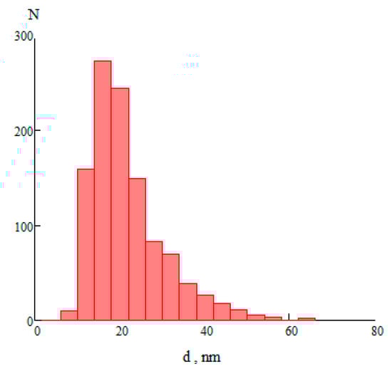The histogram of the particle size distribution, N is the number of particles, d is the particle diameter.