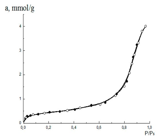 In Equation (16), the value is defined as the maximum value of the adsorption value for the rightmost boundary in the microporous region. Unfortunately, this value is determined quite arbitrarily. In real adsorbents, the rightmost boundary in the microporous region is not clearly expressed. The value is the characteristic energy of adsorption. The parameter characterizes the statistical properties of the pore distribution function in terms of the adsorption energy. For a statistically homogeneous distribution (Gaussian distribution) . In this case, the Equation (16) becomes the Dubinin-Radushkevich equation. For the considered isotherm in the region of micropores, the following values of the parameters of the Equation (16) were obtained: ; ; . Equation (16) with the given parameters describes the adsorption isotherm in the region of micropores with the maximum relative deviation .
