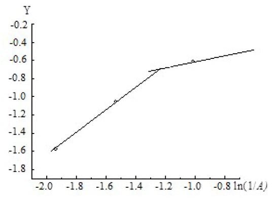 The value of m is obtained by a numerical method based on experimental dependence at . To apply Equation (17) for the description of the adsorption isotherm, the isotherm was re-plotted in the coordinates . The result is shown in Figure 6; it is seen that the isotherm consists of two straight intervals. For the first interval, the parameters (the m value and the slope) were obtained using the standard procedure; it was found that (to within the experimental error) m = 0.93. From Figure 6, an interesting feature of the quasi-one-dimensional adsorption regime becomes obvious: for low adsorbate density in the bulk the adsorbate in the pore exists as the molecular associate, while with the increase of the bulk adsorbate density above the value which corresponds to x = 0.85 the clustering of the associate takes place. This behavior resembles the transition from the gaseous phase to the condensed phase; however, an exact analogy with the phase transition cannot be drawn because the one-dimensional system is incapable to undergo any phase transition.