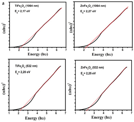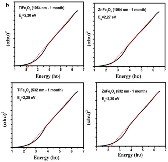 Band gap energy results for MONPs are shown in Table 2. The optical energy for TiFe2O4 and ZnFe2O4 changes slightly between 2.17 eV and 2.27 eV for 1064 nm and 532 nm and it does not present significant changes after one month of the synthesis which gives indications about the stability of the colloid over the time as can be seen in the method used, Figure 3a,b. These values are in accordance with those reported in previous works showing magnetic semiconductor behavior [40,41,42,43]. These results have a great variety of photocatalyst applications in environmental cleaning, since a small band gap is also important in any applications of NPs that involve light, as has been reported in previous works [14,34].