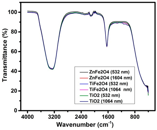 FTIR spectra of colloidal NPS are shown in Figure 4. An intense characteristic absorption band between 3300 cm−1 and 3500 cm−1 is observed, which can be assigned to the fundamental mode of vibration to O-H stretching and deformation, due to water absorption, on the metal surface. Moreover, there appears to be a band between 1637 cm−1 and 2100 cm−1 which may be attributed to the scissor bending vibration of molecular water. Vibrational peaks around 415 cm−1 reveal mainly Fe–O stretching vibration bonds. Appearance of peaks around 1600 cm−1 correspond to the overlapping of Ti–O, Fe–O–Ti, Zn–O, and Fe–O–Zn bonds of ferrite nanoparticles. All samples synthetized exhibit similar FTIR spectra. These results indicate that the structure of the MONPs is not altered by infrared radiation, regardless of the wavelength of synthesis [33,37].