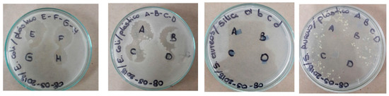 The sensitivity of strains of S. aureus and E. coli were determined using the method of planting by depth according to the Institute of Clinical and Laboratory Standards (CLSI, 2015). Seeding was performed in triplicate in each programmed experiment, with two incubation periods of 24 and 48 h at 37 °C, modifying their exposure to visible light and UV light for 2 h in some cases. The antibiotic used as a positive control was reactive grade ampicillin, which had a concentration of 1000 ppm and DMSO as target at 5%. Three squares of residual polyethylene with an area of 0.25 cm2 were placed in triplicate, with nanoparticles deposited which were labeled as follows: A (TiFe2O4, 1064 nm, 100 mJ), B (TiFe2O4, 1064 nm, 80 mJ), C (ZnFe2O4, 1064 nm, 80 mJ), D (TiFe2O4, 532 nm, 80 mJ), E (ZnFe2O4, 1064 nm, 84 mJ), and F (ZnFe2O4, 532 nm, 80 mJ). This can be seen in Figure 7. Subsequently, all samples were exposed to UV radiation at 330 nm for a time of 2 h; in comparison to antibacterial activity in the absence of light, the NPs showed enhancement of antibacterial activity when they were illuminated with UV light, which indicates the photo activation of their plasma oscillation at surface of the NPs such that it interacts strongly with the bacteria, preventing its spread via thermal effect. For interpretation of the results, the strains were classified as susceptible, intermediate, or resistant with respect to the evaluated nanoparticles, measuring the inhibition halo (CLSI, 2015). The results are displayed in Table 3 [44,45,46,47,48]. In this experiment, nanoparticles of TiFe2O4 prepared at 532 nm showed better anti-bacterial results, exhibiting an inhibition ring 30 mm in diameter in samples deposited in polyethylene substrates when they was illuminated with UV light at 330 nm.