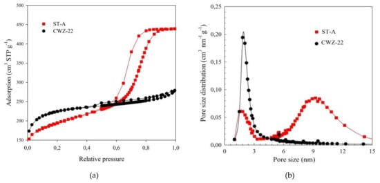 Nitrogen adsorption isotherms are shown in Figure 2a. According to IUPAC classification of adsorption isotherms [53], the experimental isotherm for studied ST-A material is type IV, which is characteristic for mesoporous solids. The H1 hysteresis loops confirm the presence of accessible mesopores. The isotherm for CWZ-22 carbon is type I. A type I isotherm indicates high adsorption in the range of low relative pressures, i.e., refers to adsorbents with highly developed microporosity (porosity, which forms pores with linear dimensions less than 2 nm). In the area of medium and high relative pressures, the isotherm for CWZ-22 carbon has a course almost parallel to the abscissae axis, which indicates that mesoporosity (pores with dimensions of 2 to 50 nm) is poorly developed [54]. The type H4 hysteresis loop for CWZ-22 carbon is associated with narrow slit pores.