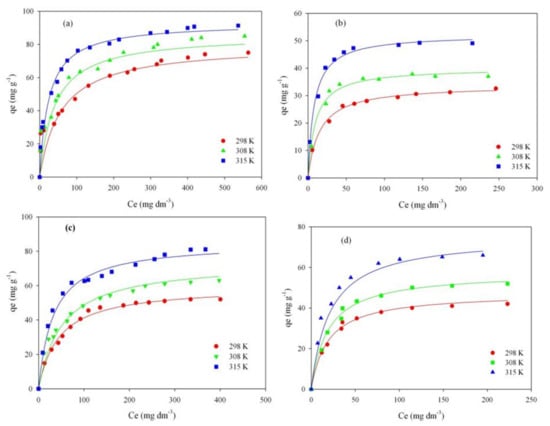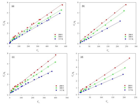 In order to check the validity of the model fit to the Langmuir adsorption isotherm, the obtained graph was plotted Ce/qe vs. Ce (Figure 4a–d). The calculated isotherm parameters are shown in Table 4.