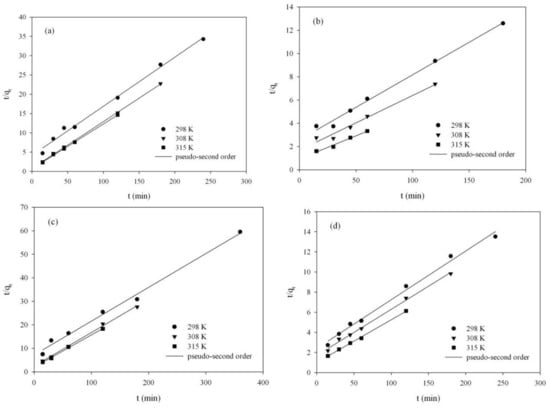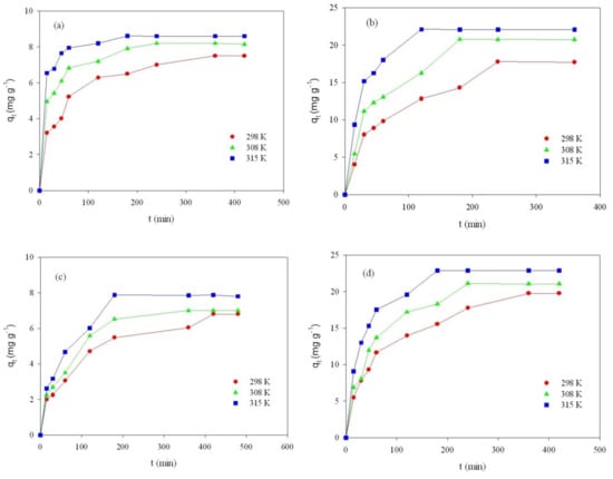 Analyzing the results, it was observed that the adsorption rate increases with increasing temperature for all studied cases (Figure 8a–d).