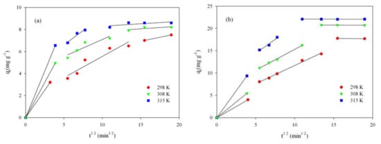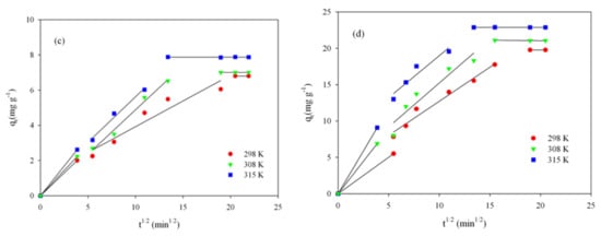 The relationship shown in Figure 7a–d allows us to identify the adsorption mechanism. The multilinear plot (solid line on the plot) indicates that in the adsorption process, several steps take part, not just intraparticle diffusion. First, the steep section corresponds to adsorption on the external surface of the adsorbent grain or an immediate adsorption. The second linear part of plot corresponds to a gradual phase, mild adsorption, where intraparticle diffusion is a controlling step of the whole adsorption. The third step corresponds to the stabilization of the adsorption process. If adsorption would only occur due to intraparticle diffusion, then the dependency qt vs. t1/2 would be rectilinear in the whole range; in addition, the curve would pass through the origin of the graph [3,13,62]. The data (Figure 7a–d) indicate that intraparticle diffusion is involved in the adsorption process, but it is not a stage controlling the speed of the entire process.