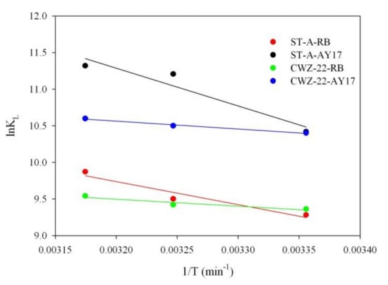 The ∆H and ∆S values were found from the slope and intercept of ln KL versus 1/T plots (Figure 9). Table 7 lists the thermodynamic parameters values obtained at different temperatures for RB and AY17 adsorption on ST-A and CWZ 22.