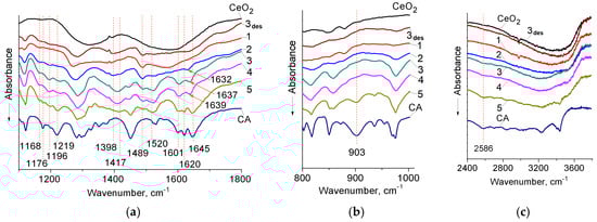 From Figure 1 it is evident, that all the spectra of CA/CeO2 contain new bands of medium intensity at ~1200, ~1168 cm−1, while νCO (1219 cm−1) [41,42,52] and βOH (1176 см–1 [52,53], 1300–1400 см–1 [52,54,55]) are shown only for high concentrations of CA (0.9 and 1.2 mmol/g). For a sample with a concentration of CA 0.6 mmol/g, an additional maximum at 1230 cm−1 appears. It should be added that in the region 1300–1400 cm−1 vibrations of C-O-H as a carboxyl group and a phenolic substituent may be observed [41,42,45,46,54]. Therefore, the overlap of these bands in the mentioned part of the spectrum is very likely.