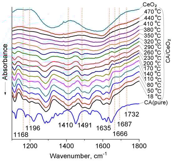 The changes in the IR spectrum of CA/CeO2 (0.6 mmol/g) that occur during heating can be traced in Figure 2. The decrease in the intensity of the bands νCOO− at ~1410 cm−1, and at ~1489 cm−1, which is due to the destruction of bidentate carboxylate complexes of CA on the surface of oxide (Scheme 1a,b), occurs to 470 °C. The band νC=O (1635 cm−1), referring to monodentate carboxylate complexes (Scheme 1c), disappears at a lower temperature (~320 °C). The hydrogen-bonded associates of CA which are observed in the spectra of CeO2 (Figure 2) about 1687 cm−1 in the form of a shoulder, are destroyed at a temperature of 260 °C. Absorption at 1168 cm−1, which in our opinion is a sign of the formation of complexes with the participation of an aromatic ligand, are seen in spectra up to a temperature of 320 °C. At a temperature of about 170 °C, new low-intensity bands appear at 1666 cm−1 and 1732 cm−1. Vibrations at 1666 cm−1 can indicate the formation of 1,2-quinones. The absorption bands of the carbonyl group of these molecules are at 1681 and 1661 cm−1 [57]. The first of these bands has a low intensity. It is known [57,58] that 1,2-quinone can be obtained by oxidation of pyrocatechol, and Ce+4 can serve as a catalyst for such a reaction [57].