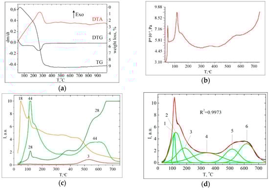 (a) Differential thermal analysis (DTA), differential thermogravimetric analysis (DTG), thermogravimetric (TG) curves; (b) Vapor pressure measured as a function of temperature (P-T); (c) temperature-programmed desorption (TPD) curves for ions with m/z 44, 28, 18, 3; (d) deconvolution of TPD curve for ions with m/z 44 for CA/CeO2 (0.6 mmol/g).