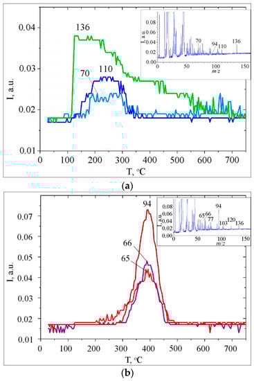 Thermal decomposition of CA/CeO2 (0.6 mmol/g): (a) Mass spectra at 240 C and TPD curves for ions with m/z 136, 110, 70; (b) mass spectra at 380 °C and TPD curves for ions with m/z 94, 66, 65 °C (b).