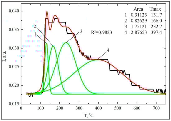 Based on the TGA data (Figure 3a, Table 2), about 68.7% of the total number of CA molecules on the surface decomposes during the second stage, probably as a result of the thermo-oxidative transformations of the CA phenolate complexes. In order to semi-quantitatively assess the relative content of various types of complexes, the integral intensities were calculated for the peaks of molecular ions of structurally related compounds with m/z 136 (3,4-dihydroxy-phenylethylene), 110 (pyrocatechol) and 94 (phenol). In addition, the deconvolution was used for decomposition the wide peak of the ion with m/z 136 for getting several Gaussians (R2 = 0.9821) (Figure 5).