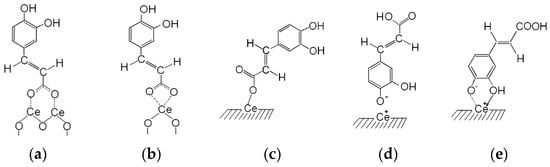 Thus, the character of the obtained spectra can indicate the presence on the surface of CeO2 as chemisorbed complexes of CA, which are formed as a result of the interaction of its phenol hydroxyl group with the surface of oxide (Scheme 1d,e), and weak hydrogen-bound complexes. The possibility of such interactions of CA with surfaces of SiO2 and Ag was shown in [37,56], respectively. In this case it cannot be excluded that the hydrogen bond can be formed by the participation of both phenol hydroxyl groups [37].