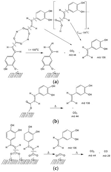 Release of 3,4-dihydroxy-phenylethylene at higher temperatures is probably due to the thermal transformations of various types of surface complexes that are bound to the surface through a carboxyl group: monodentate and bidentate (Scheme 2). From previous studies [37] it is known that the formation of 3,4-dihydroxy-phenylethylene on the surface of silica was due to the transformation of complexes bound via -COOH.