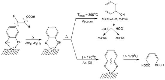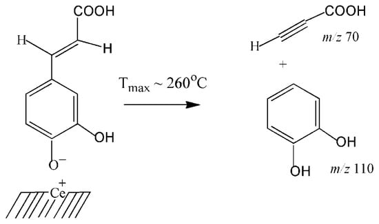 In contrast to the thermal transformations of the CA on the surface of SiO2 and in the condensed state, the decomposition of CA on the nanoceria surface is accompanied by desorption of pyrocatechol (Mr = 110 Da, m/z 110, Tmax ≈ 260 °C) and hydroxybenzene (Mr = 94 Da, m/z 94, Tmax ≈ 390 °C) (Figure 3). In our opinion, the formation of these products is due to the basic nature of the surface of cerium dioxide and its ability to generate basic hydroxyl groups. The latter deprotonate phenols and cause the formation of phenolates, the presence of which on the surface is confirmed by the FT–IR data (Table 1, Figure 1a).