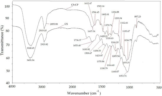 Samples of the adsorbents (CS and CS-CP) were characterized by recording their FTIR spectra (Perkin-Elmer Spectrometer, Waltham, MA, USA) in the 4000–400 cm−1 range. In each case, 2.0 mg of the dried sample and 400 mg of KBr were homogenized using a mortar and pestle and thereafter pressed into a tablet.