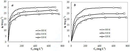 In this study, experimental adsorption isotherms were used to describe the adsorption equilibrium between the CS-CP and the anionic dyes. As seen in Figure 2, increasing the temperature from 303 K to 328 K reduced the adsorption capacity of CS-CP, and the adsorption process of anionic dyes on CS-CP was exothermic. The increasing temperature decreased the adsorptive forces between the dyes and the active sites on the adsorbent surface as a result of the decreasing adsorption capacity [16].