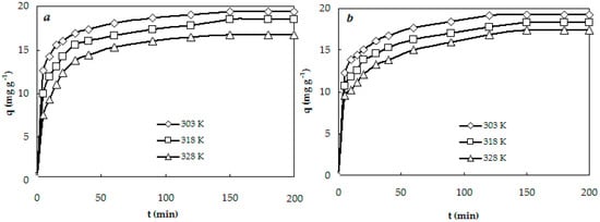 The experimental kinetic curves of the anionic dyes on CS-CP are presented in Figure 3. The adsorption process of the anionic dyes on CS-CP can be divided into two sections: (i) an initial rapid stage (to 60 min) where adsorption rate is fast; and (ii) a slower second stage where the adsorption rate becomes lower (60–150 min). It is evident from Figure 3 that the equilibrium time of the anionic dyes was 150 min at 303–328 K, but the adsorption rate was faster at 303 K than at 328 K.