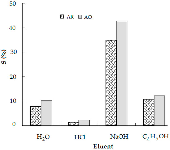 To make the adsorption process more economical, it was expedient to regenerate the used adsorbent and dyes, which could be recycled further [11]. The desorption studies are also important to understanding the adsorption mechanism of an adsorbate onto an adsorbent. Desorption of the anionic dyes from CS-CP by different eluents is presented in Figure 4.
