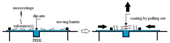 Firstly, the activated PEEK plate was attached to the dip-coater arm coupled with the Langmuir-Blodgett trough (LB 2000, KSV, Helsinki, Finland), dipped under the water subphase to carry out coating by pulling out using the LB technique. The scheme of the process is presented in Figure 3.