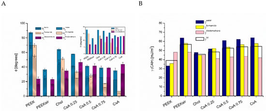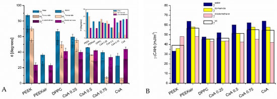 Insets in Figure 4A and Figure 5A present the values of contact angle hystereses (H) of three test liquids determined for all from the modified PEEK surfaces. However, the percentage differences ( between the advancing and receding contact angles of each liquid are variable depending on the surface composition and polarity. To fully describe the phenomena on the polymer surface, the behavior of the molecules during a film compression and transfer onto the polymer support should be considered. It is necessary to take into account the morphology, thickness, and intermolecular interactions between monolayer compounds during the process using the Langmuir trough. The previous research conducted by our team [31,32] as well as by other authors [33,34] has shown that at the interface between water and air, DPPC-CsA and Chol-CsA are in the state of expanded liquid, which is characterized by loose packing of molecules. This state is determined by the repulsion between components (negative values of excess Gibbs energy of mixing) [35]. We assumed that the basic physicochemical properties of the monolayer do not change when transferred to a polymer substrate. Therefore, the looser film is more permeable to the liquid, and thus affects the value of the contact angle hysteresis, because the liquid can penetrate deeper when measuring the receding contact angle. For instance, for the water contact angles, it changes from a minimum of 16% for DPPC-CsA at XCsA = 0.5 to 38.3% for Chol-CsA at XCsA = 0.5 (Insets in Figure 4A and Figure 5A). The percentage difference between the average advancing and receding contact angles was estimated as 23.2% (water), 32.0% (formamide), and 30.0% (diiodomethane) for PEEK coated with DPPC, CsA, and binary DPPC-CsA layers. For second system including Chol, CsA and mixed Chol-CsA layers, those differences were evaluated as 33.6% (water), 28.2% (formamide) and 30.0% (diiodomethane). During the advancing contact angle measurement, the probe liquid interacts with the monolayer deposited on the polymer plate similarly as in the other measurements [22]. In consequence, there may occur many phenomena such as the reorientation of molecules, their aggregation (e.g., under the influence of a liquid, e.g., water) or even desorption if the adhesion forces to the solid surface are insufficient [22]. According to Belman et al. [23], the lipid monolayer upon contacting with water probe liquid can even transform to the bilayer structure partially, leaving holes in the film and facilitates the liquid penetration into the layer during the measurement of receding contact angle, thus giving rise to the contact angle hysteresis. It should be taken into account that similar mechanisms can occur in our systems.