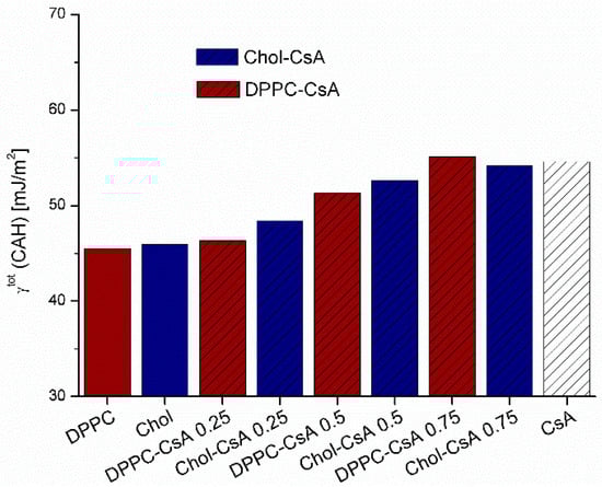 In fact, to have better insight into the changes of surface wetting properties the further analysis of the binary DPPC-CsA and Chol-CsA monolayers was conducted based on the values of surface free energy. They were estimated from the CAH approach (described precisely in the introduction) using the advancing and receding contact angles of each probe liquid separately and then an arithmetic mean of these three values (as total one) was determined (.