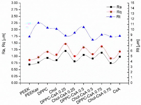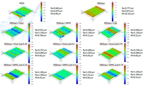 Deposition of one and/or two-component layers on the activated PEEK support always leads to the rise of the values of the Ra and Rq roughness parameters compared to those of the PEEKair sample (Figure 7). This observation results in conclusions about the formation of nano-scale irregularity onto micro-scale PEEK roughness caused by the layer preparation which can be enhanced by the PEEK plasma activation. This process was already observed on cold plasma activated PEEK surfaces after deposition of phospholipids by Jurak et al. [13]. Of the two-component films, the greater surface roughness of PEEK was observed after modification with the DPPC-CsA system compared to the Chol-CsA system. This can give information about the formation of another, possibly more compact structure with different homogeneity on the PEEKair surface. Figure 8 shows the most representative images of the obtained PEEK surfaces with the roughness parameters.