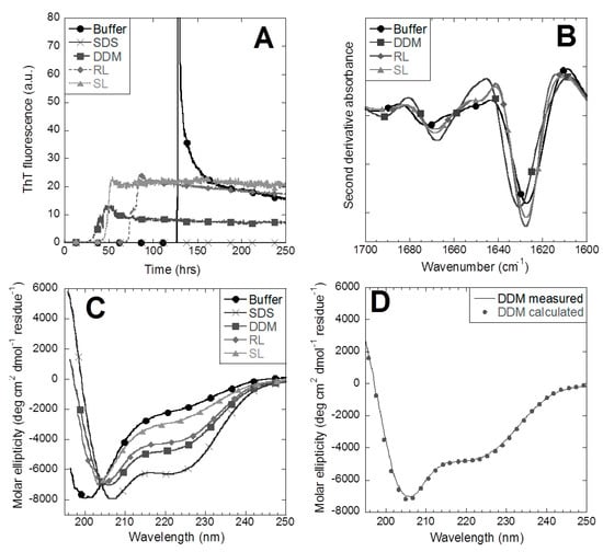 Amyloidogenic propensity of 3474 in buffer and surfactants. (A) Incubation of 3474 at 40 °C under constant agitation and monitoring amyloid formation, using the amyloid dye ThT, shows that fibrillation of 3474 is accelerated by the addition of dodecyl maltoside (DDM), rhamnolipid (RL), and sophorolipid (SL), while sodium dodecyl sulphate (SDS) inhibits aggregation completely. (B) FTIR confirms the amyloid peak of 3474. (C) The far-UV circular dichroism signal of 3474 before aggregation shows increasing α-helicity with surfactants. (D) Comparison of measured circular dichroism (CD) structure and the calculated signal of 3474-DDM based on linear combinations of its structure in buffer and SDS.